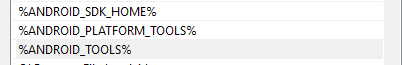 b) Also in the PATH variable, ensure that ANDROID_PLATFORM_TOOLS, ANDROID_SDK_HOME, ANDROID_TOOLS are added. In my case, ANDROID_TOOLS was not added by-default, I had to manually add it.